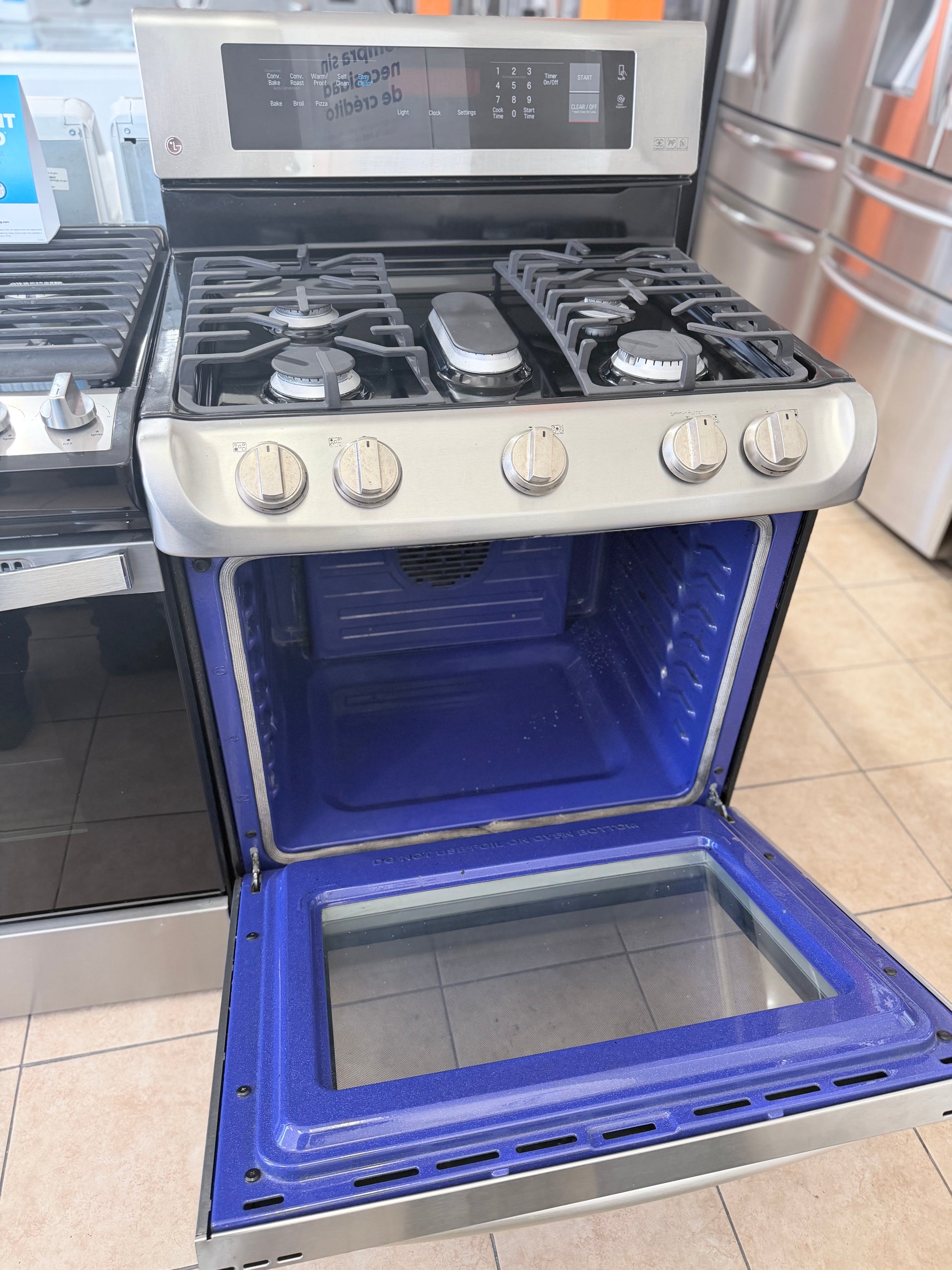 is a 30-inch, 6.3 cu. ft., stainless steel freestanding gas range. It features LG's ProBake Convection® technology, a warming drawer, and an UltraHeat™ 18,500 BTU burner.